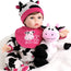 La muñeca de bebé tiene un pelo de peluca marrón suave. Bonito sombrero de vaca con patrón de vaca. Mono con bonitos zapatos de cara de vaca. Patrón de babero rojo rosa de vaca. Una alfombrilla para jugar con la muñeca de bebé. Chupete magnético y biberón